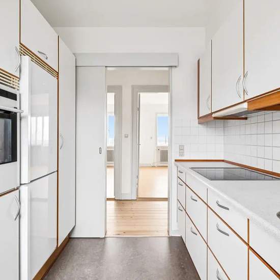 Welcome to this bright and spacious apartment of 77 square meters. As you step inside, you are greeted by an inviting entrance hall with beautiful wooden floors that extend throughout the apartment. The living room is spacious and filled with natural light from the large windows, which also provide a lovely view of the surrounding area. The bedroom is bright and has room for everything from a bed to storage. The apartment's kitchen is functionally designed and includes a dishwasher. The bathroom is modern and spacious, featuring a window a...