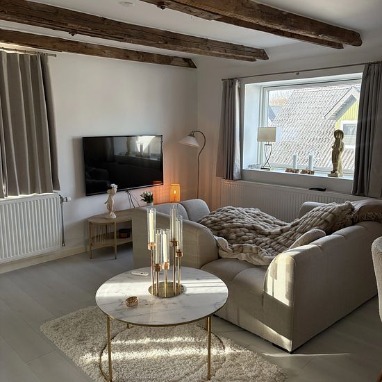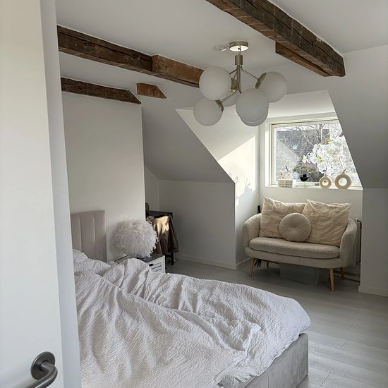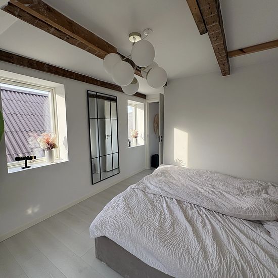 On the 1st floor. There is a lovely newly renovated apartment - with visible beams. It includes a living room/kitchen combined. The kitchen is a new white HTH kitchen with all major appliances. New bathroom with a laundry column. Large bedroom with space for wardrobes. Only small pets can be considered. All communication must be conducted in Danish.