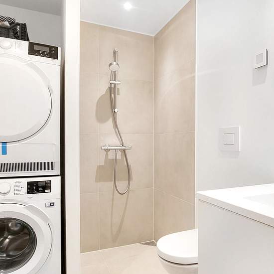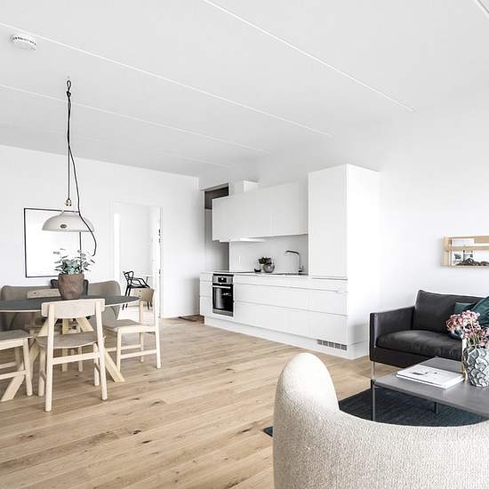 Become the tenant of this extraordinary 4-room penthouse apartment of 97 well-laid-out square meters. The apartment is located in the newly built Fjordpynten, in Nørresyndby's new district, Stigsborg. Here you get a top location with views over the fjord, the green park and the town. The apartment is arranged with a nice entrance hall, where you have access to the rental property's bathroom, which is finished in light-quality materials and includes a washer-dryer stack. Moving further into the apartment, you are greeted by the large and brig...