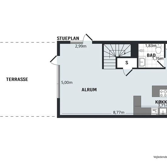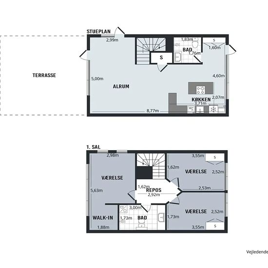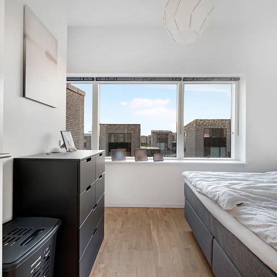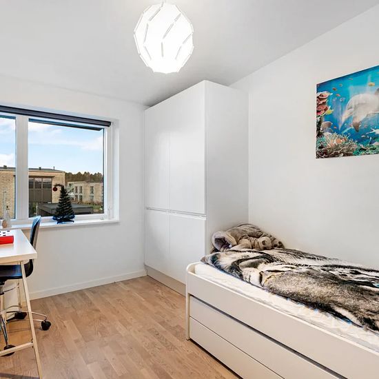 Welcome inside this large 4-room family home on Marshalls Alle. The apartment's 114 square meters are spread over 2 floors. On the ground floor, you will find, among other things, the home's spacious kitchen-dining area with a kitchen island. Adjacent to the kitchen is the home's cozy living room, which has access to a lovely terrace. On the lower floor, you will also find one of the townhouse's 2 bathrooms. On the 1st floor, you have 3 good bedrooms with built-in wardrobes as well as the home's second bathroom - here with a washer-dryer s...