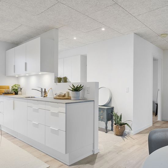 Welcome to your new family-friendly home in a modern single-story building with a private garden and terrace. The townhouses are built with a focus on high quality, functionality, and low energy consumption. You enter a spacious foyer with ample room for outerwear and shoes, and continue on to the large open living room and kitchen-dining area. Here you will find all necessary major appliances, including an integrated dishwasher and a fridge/freezer. The elegant white cabinetry from Svane Køkkenet and the beautiful laminate floors support t...