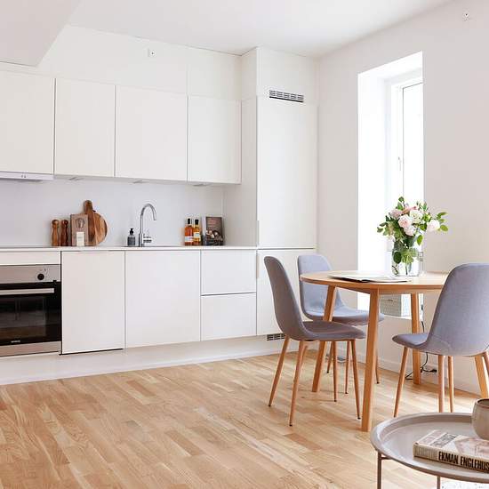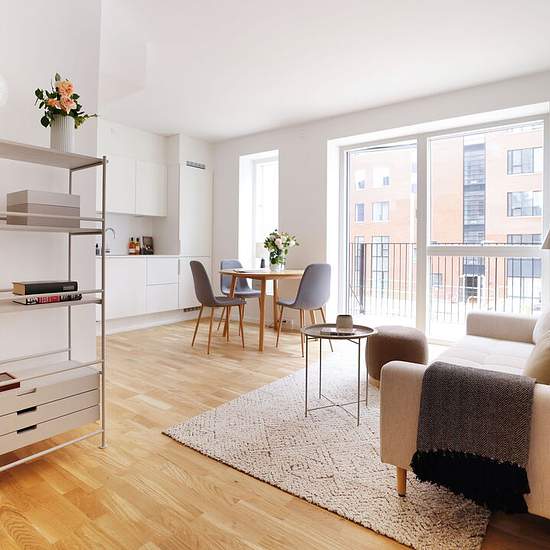Indretning: Denne skønne og optimerede lejlighed starter med at byde dig velkommen i en entré. Herefter træder du ind i det store åbne køkken-alrum, hvor det smukke hvide Svane køkken, står i god kontrast til de varme egetræsparketgulve med gulvvarme. Køkkenet har alt i hårde hvidevarer, kogeplade, køle-/fryseskab, indbygningsovn og opvaskemaskine. Det store lyse køkken-alrum kan fint indrettes med spiseafdeling i forlængelse af køkkenet samt et hyggeligt stueområde. Fra alrummet har man udgang til en dejlig stor sydvendt altan, hvor udelive...