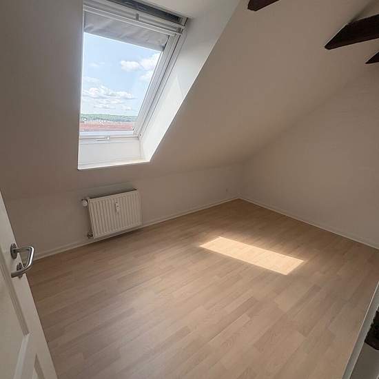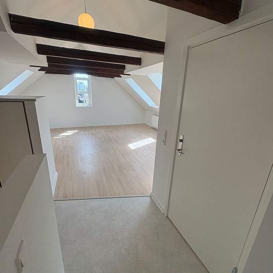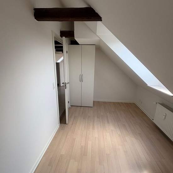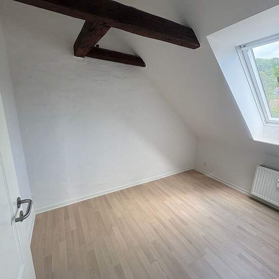 Flot 3. værelses lejlighed med udsigt, synlige bjælker samt delevenlig.