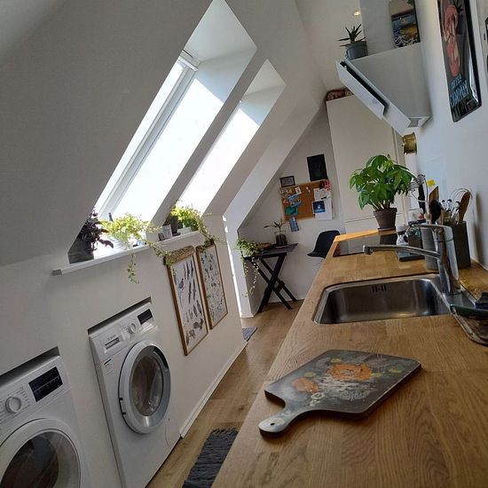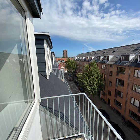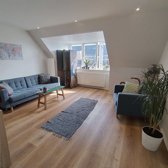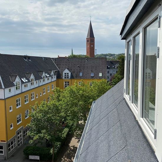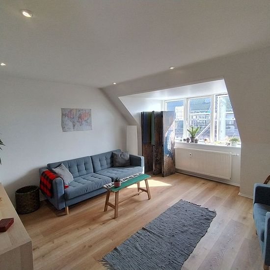 Cozy 2-room apartment with a view – Vestbyen In the heart of Vestbyen and with a beautiful view over the city's rooftops, this cozy apartment of 75 m² is located. The property is beautiful and well-maintained with energy-efficient windows, extra insulation, bicycle storage room, storage room, etc. The apartment includes: Spacious and large entrance hall Cozy kitchen with slanted walls, nice cabinets and appliances including washing machine and dryer and access to Small balcony Bright living room Access to smaller room/office Bathroo...
