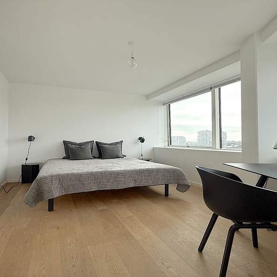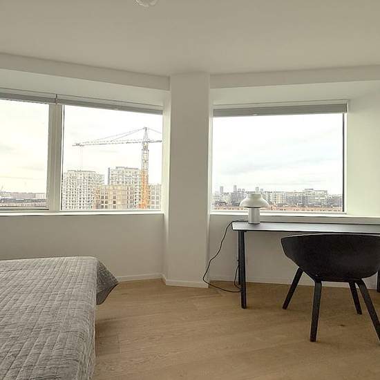 This lovely apartment is on the 7th floor, with a fantastic view over both Fælleden and Copenhagen Harbour. The kitchen and living room are open-plan and extend through the apartment. The kitchen area is spacious and has a large dining section. There is also access to a large terrace. The apartment has three bedrooms, all three with a lovely view. One of the bedrooms has direct access to its own en-suite bathroom. There is an additional bathroom with a shower and a combined washer/dryer. There is an elevator in the building. The property is ...