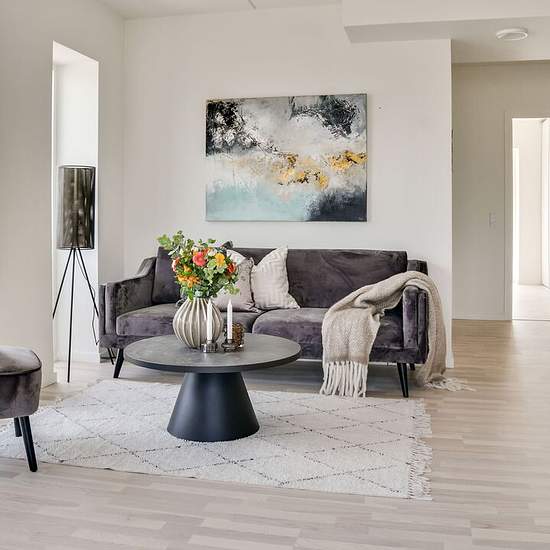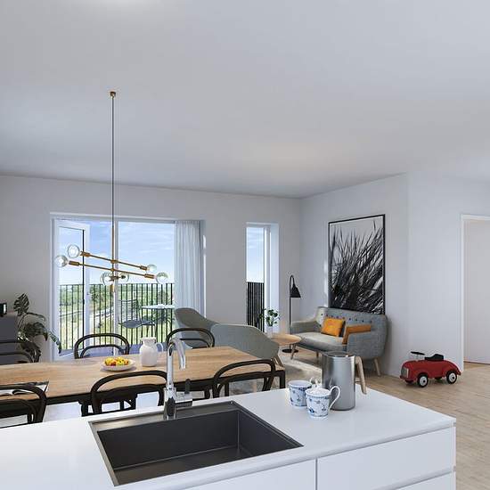 Boligen: Skøn og rummelig bolig med gode indretningsmuligheder. Fra entré med gode opbevaringsplads er der adgang til stor åbne stue og køkkenalrum. Stor stue med plads til både sofaarrangement og spiseafdeling. Fra stuen er der adgang til rummelig altan hvor udelivet og den ugenerte udsigt kan nydes. Moderne køkken med køkkenø, som giver ekstra god bordplads og opbevaringsmuligheder. Køkkenet er indrettet med alt i hårde hvidevarer. Fra stuen og en lille mellemgang er der adgang til det store soveværelser og badeværelset. Stort sovevær...