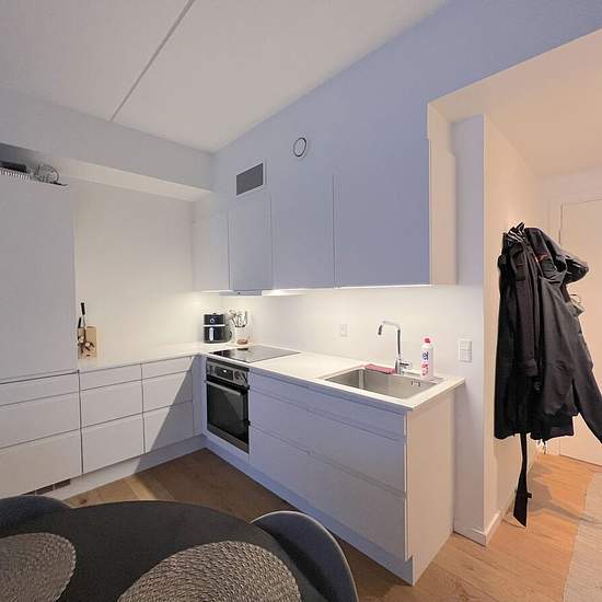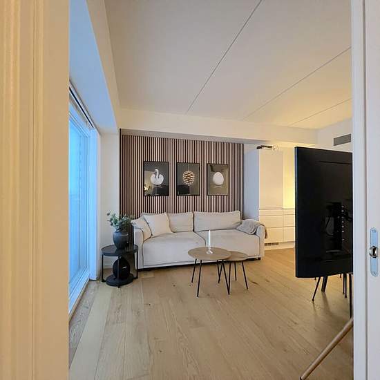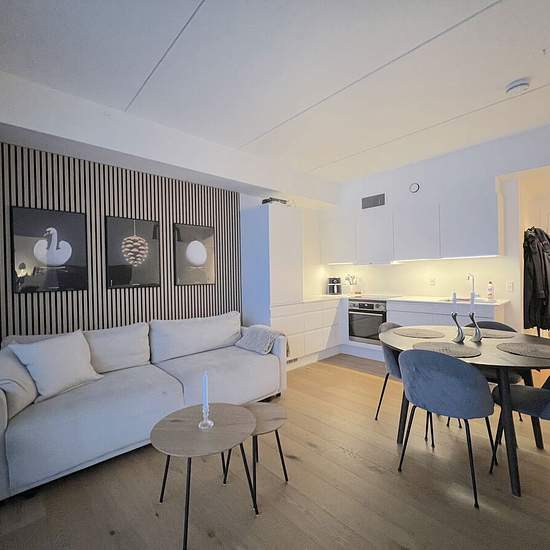 Lejligheden er beliggende i det nyopførte Fjordpynten, i Nørresyndbys nye bydel, Stigsborg. Her får du en beliggenhed helt i top, med udsigt til fjorden, den grønne park og byen. Træd ind i dit nye hjem og bliv mødt af en følelse af luksus og komfort. Lejligheden er opført i kvalitetsmaterialer og er indrettet med øje for detaljen. Her får du blandt andet et stilfuldt HTH-køkken, udstyret med en grebsfri indretning og en elegant Corian-bordplade, samt en komplet hvidevarepakke fra AEG, der inkluderer opvaskemaskine, vaskemaskine og tørretumb...