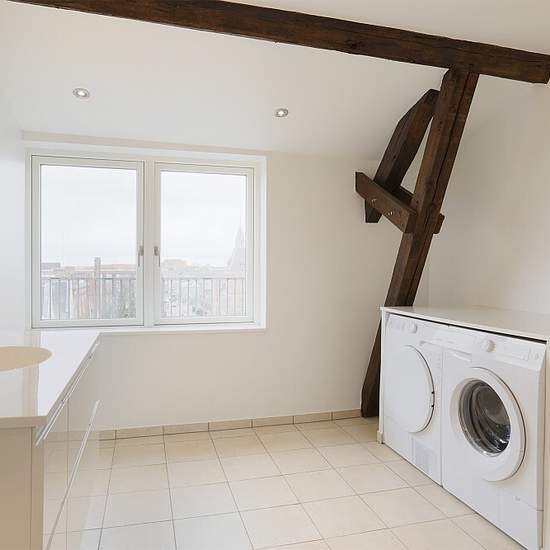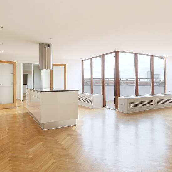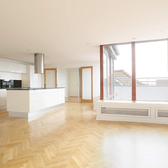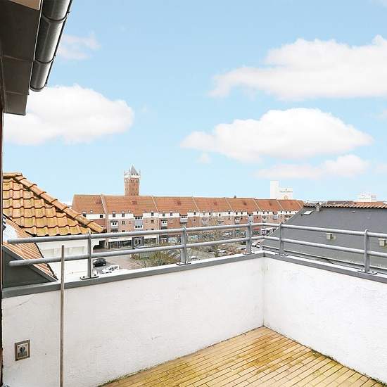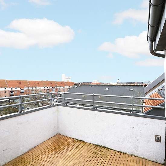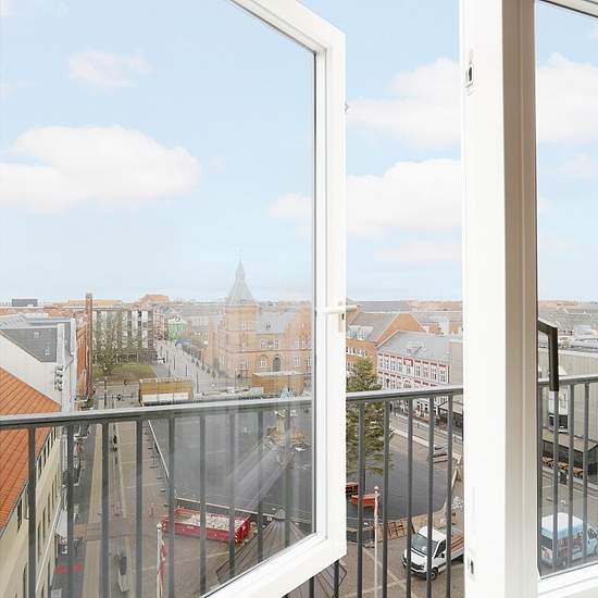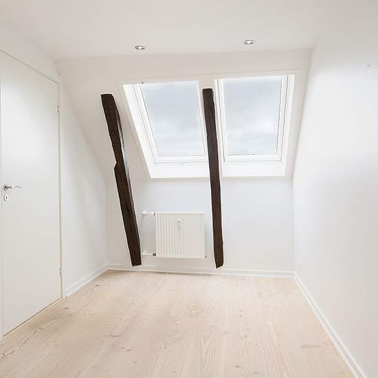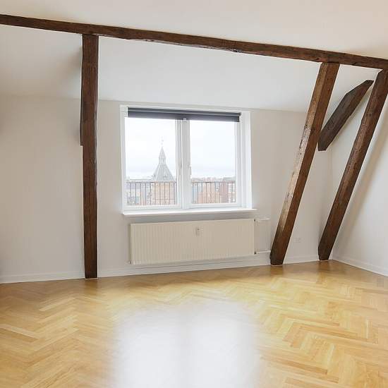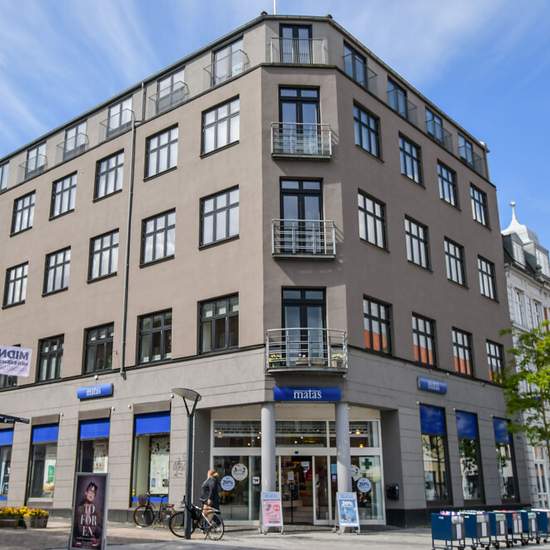 This modern and unique stately apartment was newly created in 2013 and is located on the 4th floor of the distinctive corner building that houses Matas on the Square. Entrance is from Torvegade via a bright, wide stairwell with tiled steps. Inside the apartment you are met by a bright entrance hall with white-painted walls, large built-in wardrobe walls with sliding doors and mirrors, and LED spotlights. Attention has been paid to the details throughout, and the apartment is, among other things, fitted with beautiful herringbone parquet i...