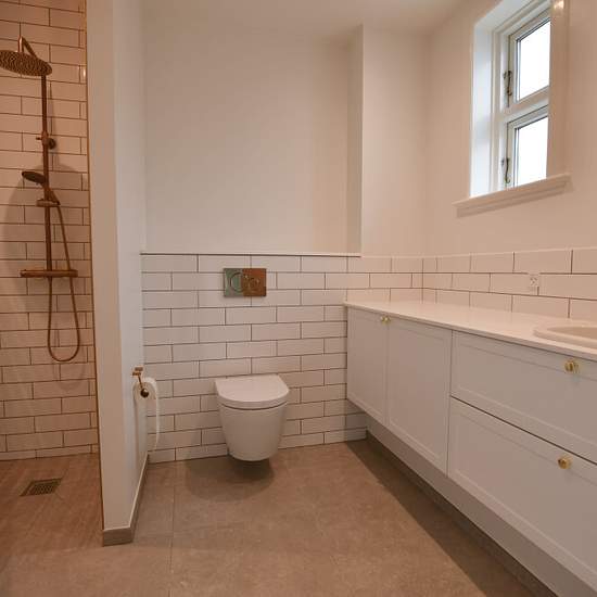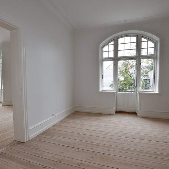 This beautiful and well-appointed 5-room apartment is located on the first floor of one of Esbjerg's finest properties, "West-End," on the corner of Kongensgade and Stormgade. Entrance to the apartment is from Kongensgade via a beautiful, bright staircase with several fine woodwork details. The apartment is laid out with an entrance hall that gives access to a charming small toilet. The kitchen from 2022 is large and spacious and in keeping with the property's style. When you step into the two formal living rooms you are met by beautiful...