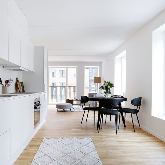 Interior: This lovely and optimized apartment begins by welcoming you into an entrance hall. Then you step into the large open kitchen-living area, where the beautiful white Svane kitchen stands in good contrast to the warm oak parquet floors with underfloor heating. The kitchen has all the major appliances, including a cooktop, fridge/freezer, built-in oven, and dishwasher. The large bright kitchen-living area can easily be furnished with a dining section adjacent to the kitchen as well as a cozy living space. From the living area, you have...