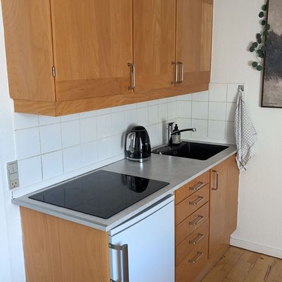 Cozy 1-room apartment in Haderslev city center. Large lovely room, nice kitchen, and spacious bathroom with washing machine and dryer.