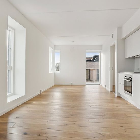 The Residence The apartments come with terrace or balcony, distributed over 2-4 rooms. Here you find large window sections, beautiful oak plank flooring, underfloor heating, white HTH kitchen with integrated Siemens appliances – and a bathroom with a laundry column and large dark gray tiles. There are both open kitchen/living areas and closed kitchens, with some residences featuring extra ceiling height. The Property Fasanrækkerne is a modern residential block in Ørestad South, designed by the award-winning Juul I Frost Architects, who ha...