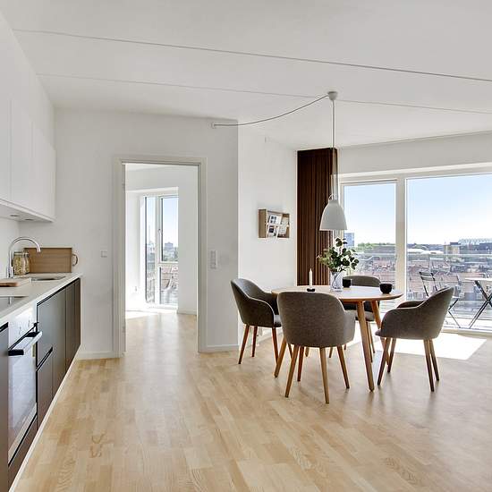 Welcome to this lovely 3-room apartment located in Ceres Plaza in Aarhus C. In this 3-room apartment care has been taken with the details. The kitchen is finished with beautiful touches, the wooden floors are in light tones, and all major appliances are included with the apartment. The terrace is lovely and sunny — and it is no more than a 5-minute walk to the vibrant city life along the river in Aarhus.