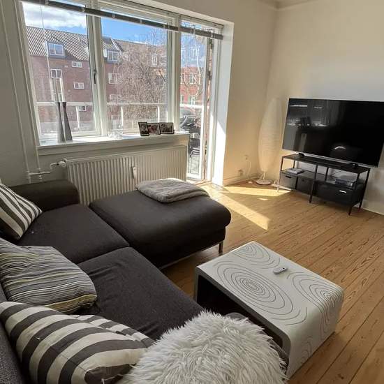 This 3-room apartment is only 50 meters from Stjernepladsen, from where there is good bus and light rail connection to most of Aarhus. The apartment measures 64 m2 and consists of a spacious bedroom, a smaller kitchen and a functional bathroom, as well as a bright living room with access to a sun-facing balcony that looks out over a large, quiet and green courtyard area. The apartment includes a private storage room, a shared laundry and drying cellar, bicycle parking and a communal terrace area opening onto the green courtyard. The apart...