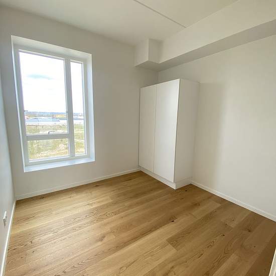 Rent this beautiful three-room apartment of 67 square meters. The apartment is located in the newly built Fjordpynten, in Nørresundby’s new district, Stigsborg. Here you get a top location with views over the fjord, the green park and the city of Aalborg. You step into the apartment's entrance hall. From here you are met by the large, bright open-plan kitchen and living area, where light streams in through the large windows. In the kitchen you can look forward to cooking in the lovely handleless HTH kitchen with a Corian countertop and a ful...