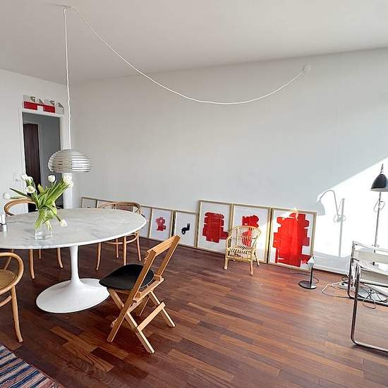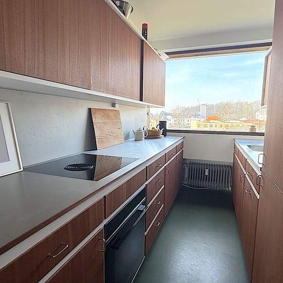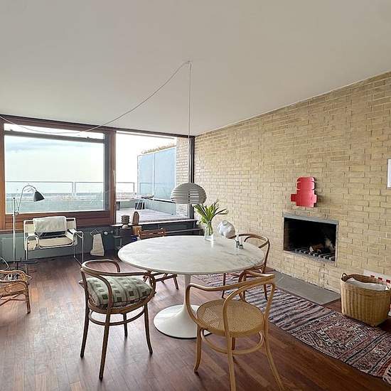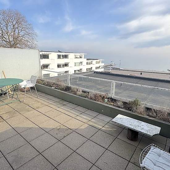 The apartment is on the 4th floor, the top floor, in a building with an elevator. The entrance hall is spacious and wonderfully bright with skylights. The heart of the apartment is a spacious, light-filled living room with a fireplace and access to a lovely terrace with views over the Øresund and Bellevue Beach. The bedroom has built-in wardrobes and views toward Klampenborg station and Dyrehaven. The bathroom has a skylight and a small bathtub with a shower. Cozy and elegant kitchen, with a dishwasher as well as a combined washer/dryer. The...