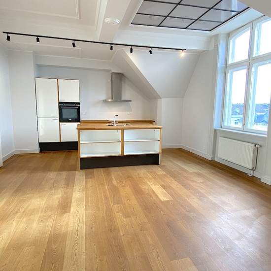 Lovely bright four-room apartment. The apartment comprises a large entrance hall and corridor with storage space. Delightful kitchen/dining area with plenty of room for guests and a view over Sankt Annæ Plads. Living room with a vaulted ceiling and a small, cozy mezzanine overlooking the living room. Two bedrooms and a bright bathroom with a shower. There is a washing machine and a tumble dryer. The building has an elevator and a courtyard for bicycles. The apartment is located in a beautiful property on the popular Sankt Annæ Plads with man...