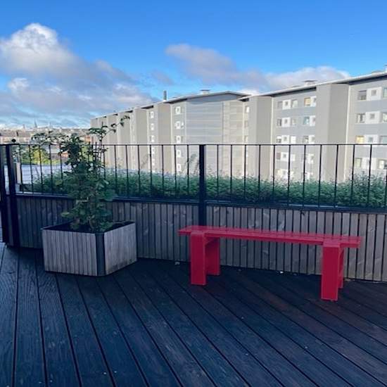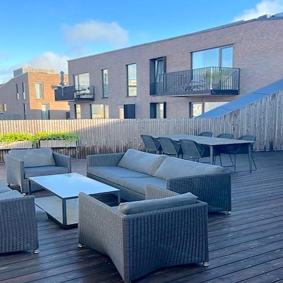 The apartment is located on the ground floor. It consists of an entrance area with direct access to the spacious living room. The kitchen is open to the living room. From the spacious living room/kitchen area there is access to a west-facing balcony. Two bedrooms and a bathroom with a shower and a washer/dryer. In addition to access to a cozy courtyard, there are shared roof terraces with a beautiful view over the city. There is an elevator in the building, car and bicycle parking in the basement, and the option to rent a parking space in th...