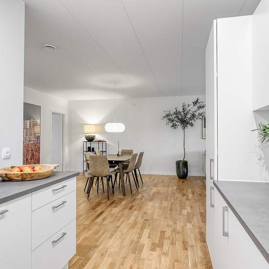 Welcome to Hamlet’s Have in Helsingør, which offers terraced houses in one and two storeys. Here we welcome you into a single-storey terraced house, where you step into a spacious entrance hall with access to the first of three bedrooms. From the entrance you step into the large open kitchen-living area connected to the living room, which has plenty of space for both a dining table and a sofa arrangement. There is also access to two bedrooms and the home's bathroom with attractive light tiles and a shower niche. Off the living room there is ...