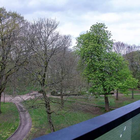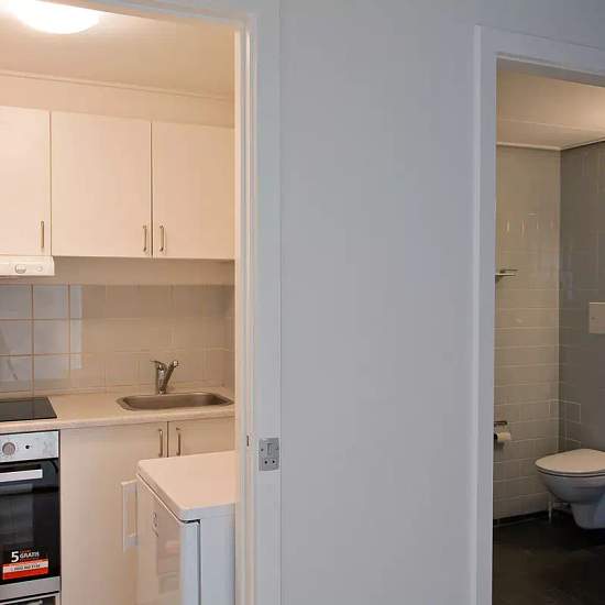 This cozy apartment offers a spacious living room with a large set of windows that lets in beautiful natural light. The bedroom has practical built-in wardrobes and direct access to a lovely balcony overlooking green areas. The bathroom is fitted with a shower, and the apartment has a functional kitchenette. The apartment has an older kitchen and bathroom but is located in an attractive area close to shopping facilities and only 2 km from the center. There is a communal laundry room in the building, a private basement storage room, and the ...