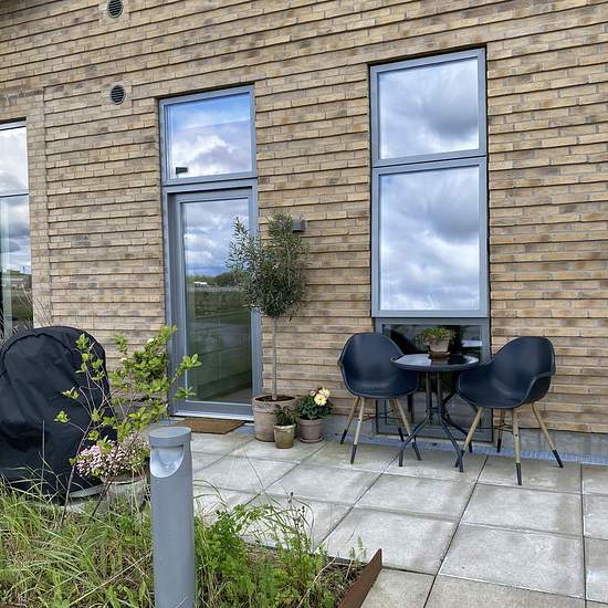 Lys lejlighed med egen terrasse, beliggende ved fjord og natur
