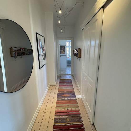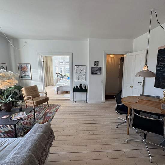 Velkommen til en rummelig og indbydende lejlighed på 104 m2, hvor lyse plankegulve, højt til loftet og klassiske detaljer som fyldningsdøre og dobbeltdøre sætter en rolig og tidløs ramme om hverdagen. Planløsningen er hverdagsvenlig med tre værelser og en lys stue, der samler hjemmet og giver god plads til både sofa- og spiseafdeling. De store vinduespartier giver et behageligt lysindfald og et rart kig mod både gade og gård. Køkkenet er pænt og funktionelt med god skabs- og bordplads, spiseplads og opvaskemaskine – lige til at gå til i en t...