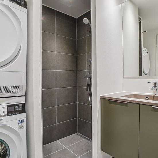 Om boligen: Som noget helt enestående, får du i dette byggeri et smukt, olivengrønt Invita køkken. Der er installeret hvidevarer fra Electrolux og i nogle køkkener er ovnen hævet, for at give en endnu bedre arbejdshøjde. På badeværelset går den olivengrønne farve igen og giver et naturligt og roligt udtryk i rummet. Her er installeret både vaskemaskine og tørretumbler fra Electrolux. Gulvene er i eg og der er gulvvarme i hele boligen. Der er indbyggede skabe med god plads til opbevaring og derudover har alle boliger depotrum enten i lejlighe...