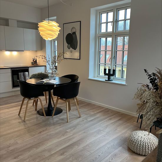 This beautiful 4-room apartment at the former Torvet will soon be ready for new tenants. You will enjoy living right in the heart of our cozy town, but also right in the forest, where you can exercise and walk the dog or just go alone. The home is heated with underfloor heating and features a lovely HTH kitchen installed. All appliances are Blomberg brand (except for the washer/dryer stack, but there is a provision for it). There is a nice shower bathroom, an open kitchen connected to the living room, which has access to the balcony, and t...