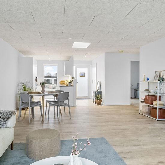 Welcome to your new family-friendly home in a modern single-story building with your own private garden and terrace. The terraced houses are built with a focus on high quality, functionality, and low energy consumption. You enter a spacious entrance hall with plenty of room for coats and shoes and continue on to the large open living room and kitchen-dining area. Here you will find all necessary appliances, including an integrated dishwasher and a fridge/freezer. The elegant white cabinetry from Svane Køkkenet and the beautiful laminate flo...