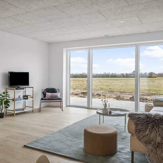 Welcome to your new family-friendly home in a modern single-storey development with its own private garden and terrace. The terraced houses have been built with a focus on high quality, functionality and low energy consumption. You enter a spacious entrance hall with plenty of room for coats and shoes, and continue into the large open living room and kitchen-dining area. Here you will find all necessary major appliances, including an integrated dishwasher and a fridge/freezer. The elegant white cabinet units from Svane Køkkenet and the attr...