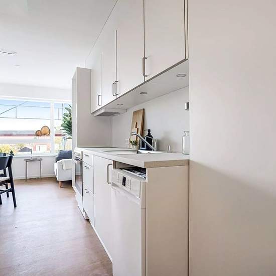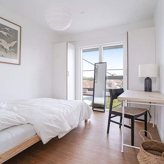 Newly built bright apartment An open and bright kitchen-living area (incl. dishwasher), excellent for both cooking and socializing. A spacious bedroom with plenty of natural light, access to the roof terrace — a nice retreat for relaxing or cozy evenings with friends. Close to the pedestrian street, shopping, green natural areas, and a 2-minute walk to the nearest bus stop. Approx. 5 km to SDU, approx. 4 km to UCL on Niels Bohrs Alle and approx. 2 km to UCL on Seebladsgade. Internet is included in the rent. There is bicycle parking. Water ...