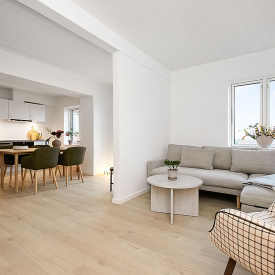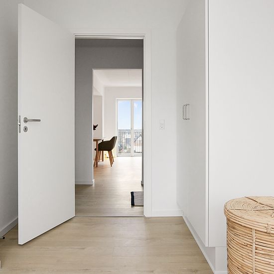 This 3-room apartment on the 3rd floor is arranged as follows: Entrance from the hallway, from where you enter an entryway. To the left is the entrance to a room with 3 built-in wardrobes. The next door you come to leads into the bedroom, which also has built-in wardrobes and a lovely view of the forest. To the left is the bathroom, which is spacious with cabinets and prepared for a washing machine/dryer. The kitchen is from Svane and includes all built-in appliances. It is open-plan to the living room. There is underfloor heating in the apa...