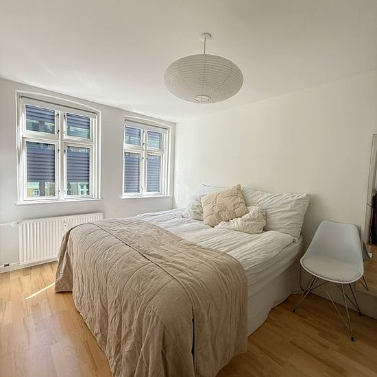 Close to Vejle pedestrian street and St. Nicolai Church, you will find this beautiful 2-room apartment. The apartment includes a small entrance, a large nice living room in an open extension with the kitchen, with space for a dining table, a large bedroom with an attached wardrobe, and a large bright bathroom. The apartment comes with all major appliances. Pets are not allowed. Possibility to purchase a parking space. The apartment includes a locked bike cellar and storage room – these can also be seen during viewings. An apartment tha...