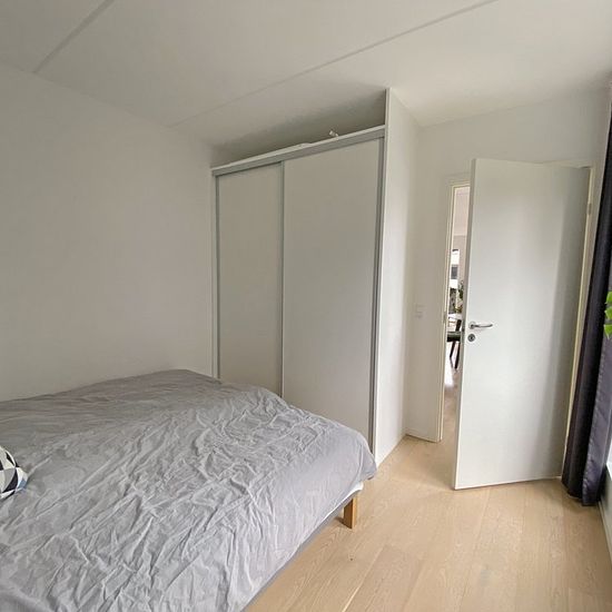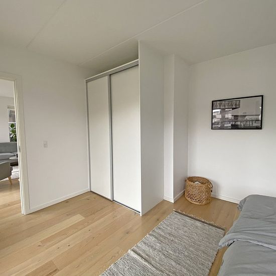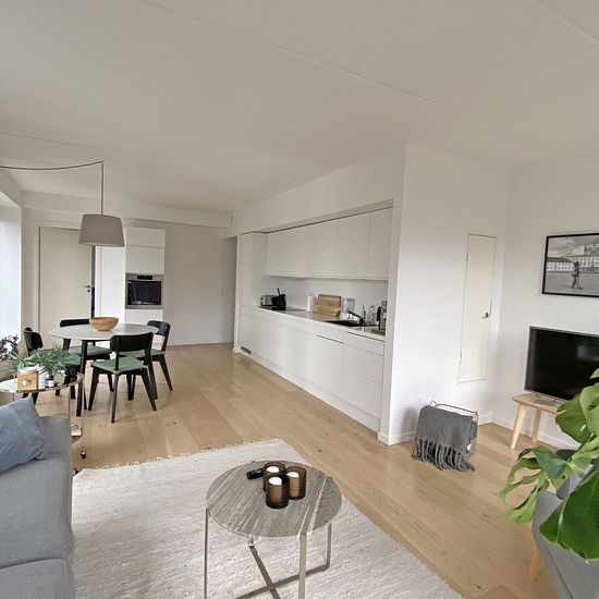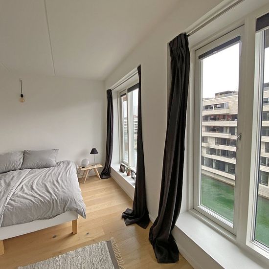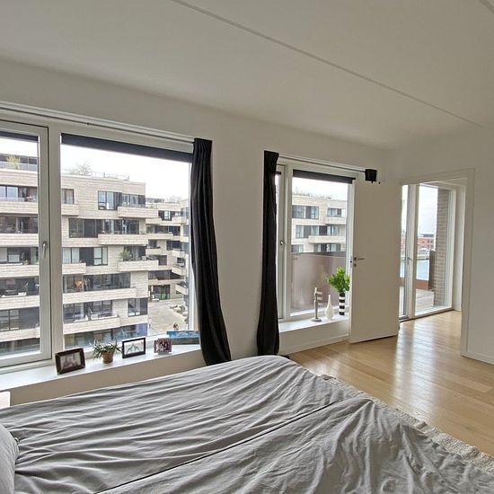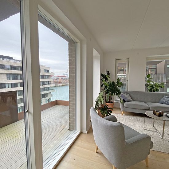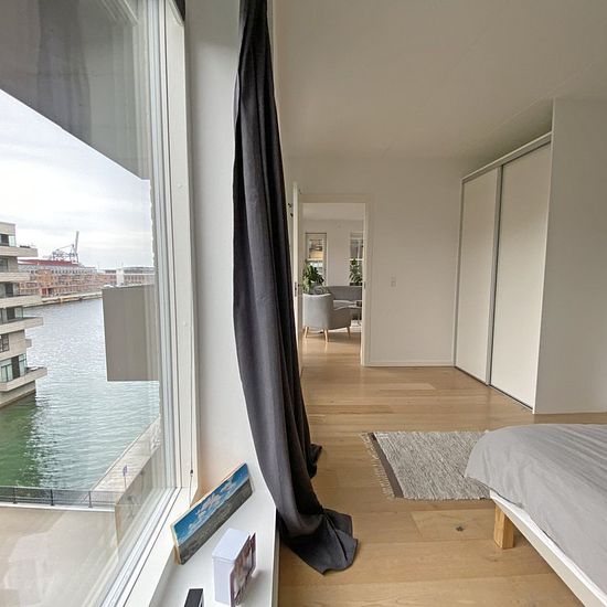 This lovely, furnished corner apartment is located in one of the absolute best locations in Nordhavn, right by Kronløbsøen, where you get a unique view of both the open water and the lively, cozy street environment. The apartment offers fantastic natural light from the large windows, bringing the water in the canals close by and creating a bright and inviting atmosphere throughout the home. The open kitchen and living room naturally merge together, and from here there is access to a spacious balcony where the view of both the canal and the o...