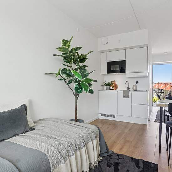 Only 1.4 km from Nørrebrogade you’ll find Frederikssundsvej 100, where one of the 73 well-appointed studio apartments awaits. The residence is perfect for anyone who wants a functional, uncomplicated life where every square metre is used optimally. The green courtyard offers space for both socialising and peaceful time alone. Location With Bellahøj Swimming Pool, Nørrebro Station and several green areas nearby, everything you need is within reach. Nordvest offers a wealth of shops, eateries and cafés, while you also have access to green oas...