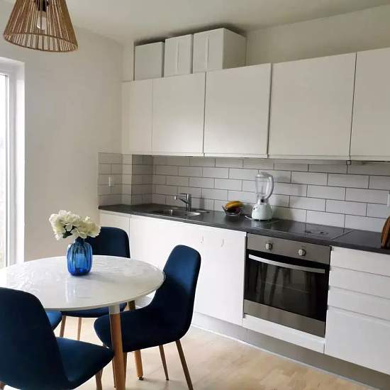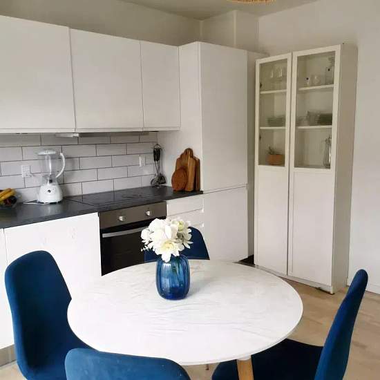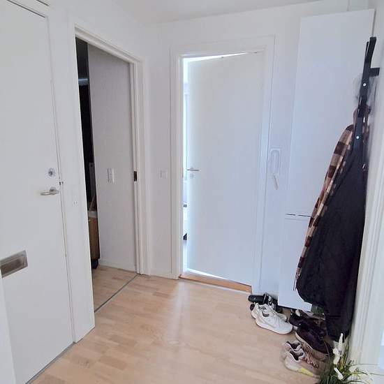 Welcome to a move-in ready two-room apartment of 64 m2 with a functional layout. Here you get a modern home that suits either a single person or a couple, with quality materials, pleasant natural light and practical solutions. The apartment includes a large hallway. From here you have access to a stylish, sleek kitchen with good cupboard and counter space and integrated appliances — including a dishwasher, built-in oven and fridge-freezer. There is ample room for a dining table in front of the French balcony, where you can open up for fresh ...