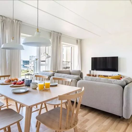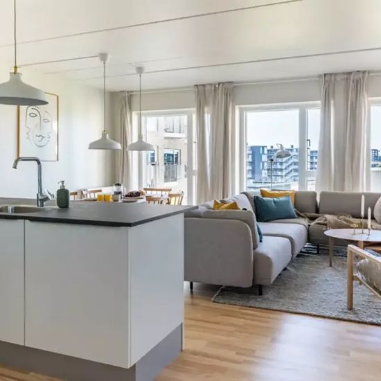 This modern apartment has beautiful wooden floors and large double glass windows and central heating. There are 3 bedrooms, an open kitchen with dining area and a lounge area with TV. There is 1 shared bathroom with a laundry machine and dryer. From the kitchen / livingroom you have access to the a large shared balcony, and the building has a green backyard with tables and benches. 50 meters from the backyard, at the water front, there is an event room which can be booked for social events exclusively by the tenants in the building complex. ...