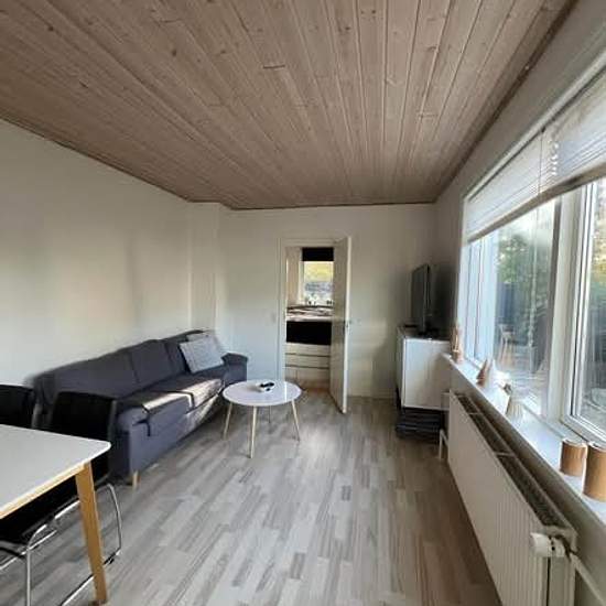 Small nice two-room ground-floor apartment with a newer kitchen and bathroom. The apartment consists of an entrance hall, bathroom, kitchen, living room and a small bedroom. The apartment includes a lovely and private terrace. For rent to a quiet tenant, preferably a student. Rent 3200, Utilities 600 Deposit: 3× rent No pets. Available from 1/2-26 or later