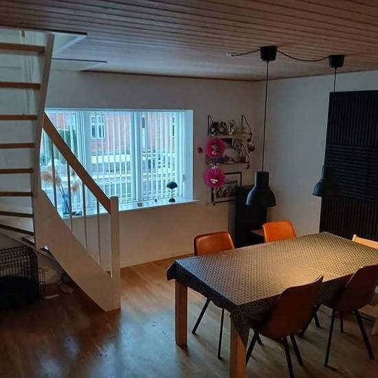 Hus i to planer 136m" Indeholder køkken, spisestue, stue, soveværelseforgang og baggang med masser af faste skabe og bad/toilet. Førstesalen indeholder to meget store værelser begge med hems og et kontor. Der er frostfri værksted/udhus. Huset opvarmes med en økonomisk varmepumpe (luft til vand) Pris 6200kr/mdr. + aconto vand 300 kr. Tre måneders husleje I indskud. Huset leveres nyistandsat. Ledigt pr. 1.maj.