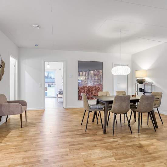 Welcome to Hamlets Have in Helsingør, which offers terraced houses in one- and two-storey layouts. Here we welcome you into a single-storey terraced house, where you step into a spacious entrance hall with access to the first of three bedrooms. From the entrance you step into the large open-plan kitchen-dining area that connects with the living room, where there is plenty of space for both dining furniture and a sofa arrangement. Here there is also access to two bedrooms as well as the home's bathroom with beautiful light tiles and a shower ...