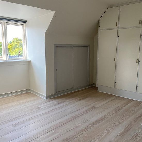 Welcome to a spacious and inviting apartment where bright surfaces, classic details, and well-utilized square meters go hand in hand. The home is spread over an entrance hall with further access to a bright living room, a lovely eat-in kitchen, two good bedrooms, and a nice bathroom. In the living room, several windows create a pleasant influx of light, and the beautiful plank floors along with the charming curved opening give the room character and a calm atmosphere with views of the city's rooftops. The kitchen is bright and functional wit...