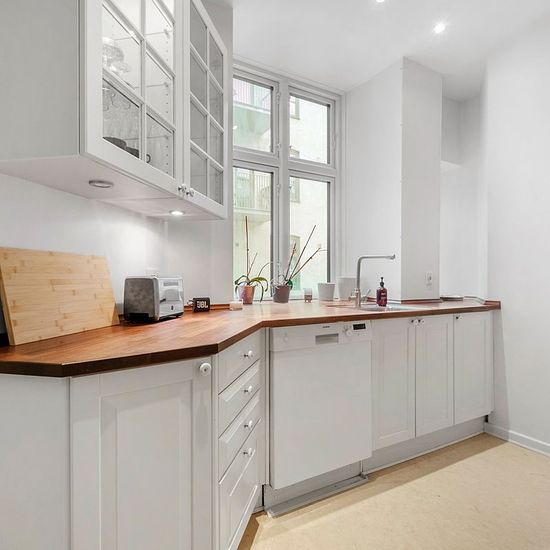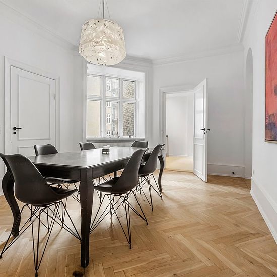 The residence: Behind the classic façade lies 139 m² of calm, spaciousness and beautiful proportions. The apartment comprises three bedrooms and two living rooms en suite, where light falls softly through the large windows and the rooms flow naturally into one another. The high ceilings provide air and volume, and the layout invites both everyday living, quiet reflection and long dinners with friends. The area: Holbergsgade is located in the historic Gammelholm – in the heart of Copenhagen, yet with a rare calm. The street is named after Lu...
