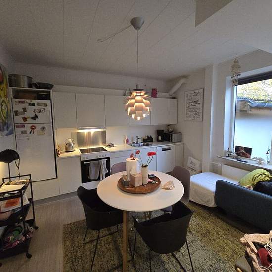 Are you looking for an apartment with a central location that is still set back from Vejle’s nightlife? Then this might be the apartment for you. Located on the ground floor on Aagade, you will find our take on a lovely, renovated home. The apartment comprises a small entrance hall with space for outerwear, a bathroom, a kitchen with a cool feature wall that brings a New York vibe and perfectly complements the rest of the apartment, a living room with a large window section, and finally a bedroom with wardrobes. The building has a courtya...