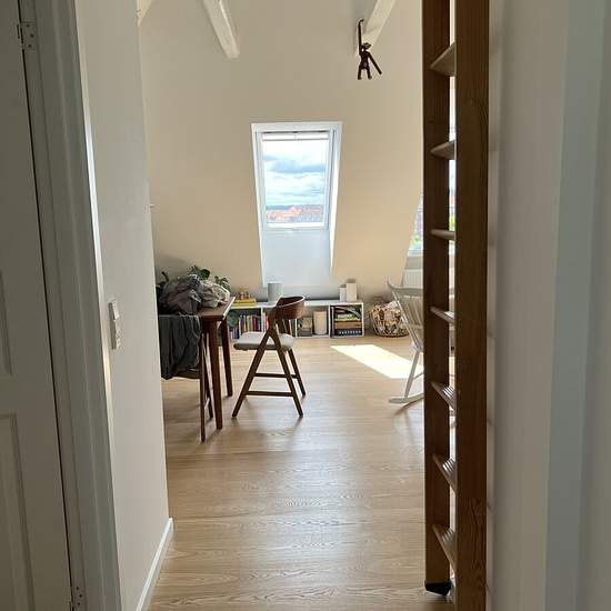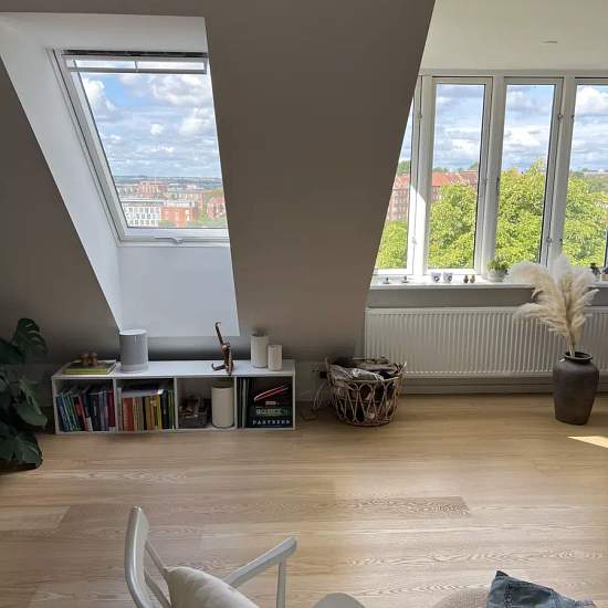 Suveræn taglejlighed med hems og 8 m2 terrasse. Flot og velindrettet 2 vær. fra 2013. Indeh. entre i åben forbindelse m/ stor stue med 2 kviste og god hems, soveværelse med kvist og plads til det fornødne, godt badeværelse med lyse klinker, gulvvarme, bruseniche og plads til vaskesøjle, rummeligt køkken m/flotte hvide HTH elementer, integrerede hårde hvidevarer, evt. lille spiseplads og udgang til skøn tagterrasse på 8 m2. Beliggende i flot gennemrenoveret ejendom - dejlig og ugeneret udsigt fra lejligheden til bl.a. Den Gamle By og Bota...