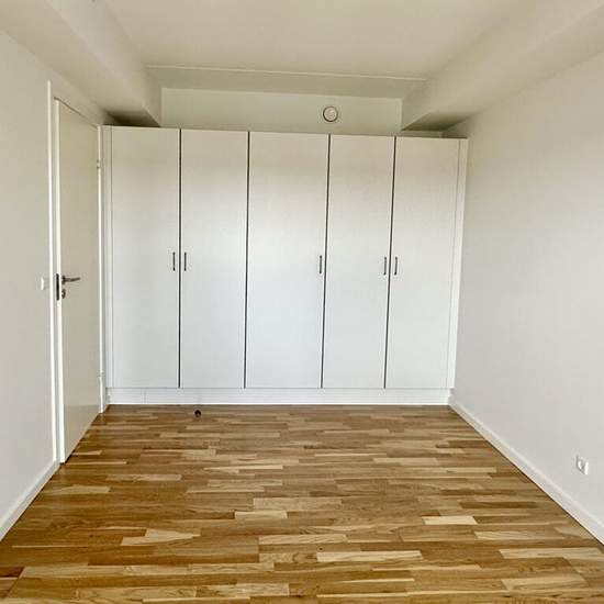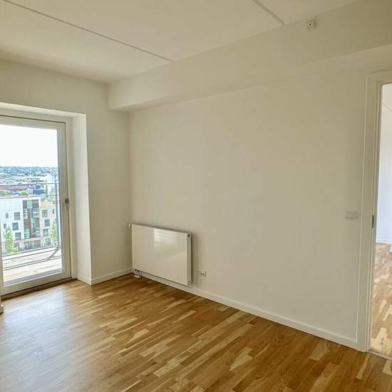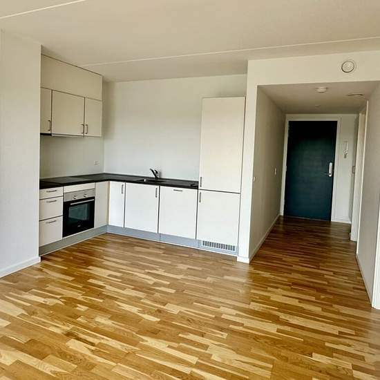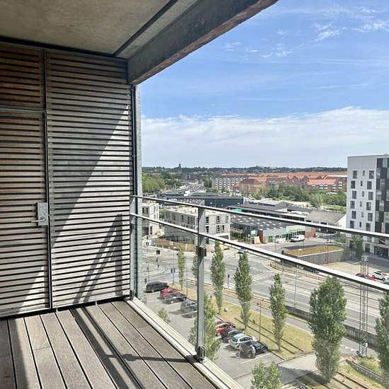 This lovely bright apartment is located on the new, exciting Godsbane area in a fine newer building constructed in 2016. The apartment comprises a nice entrance hall with built-in closets, a lovely bright kitchen with all major appliances and open to the living room, from which there is access to a delightful balcony with a storage room and a unique view over Aalborg and the surrounding area. The bedroom has a good wall of wardrobes and also direct access to the balcony. Lovely bright bathroom with light tiles and underfloor heating, a comb...