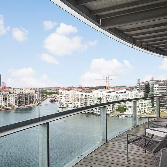 Beliggende øverst i 'Gemini-Residence' er denne helt fantastiske og meget lækre penthouse nu til leje. Lejligheden er sydvendt og har flere udgange til en stor overdækket altan på ca. 45 m2 med en fantastisk udsigt over Amager Fælled, Islands Brygge og havneforløbet og vandet i Københavns Havn. En absolut særlig lejlighed. Man ankommer med elevator til 7. sal. Her er videre gang til lejlighedens entre. Når man træder ind i lejligheden, ankommer man i stort stuerum. Her rammes man med det samme af det imponerende naturlige lysindfald og drage...
