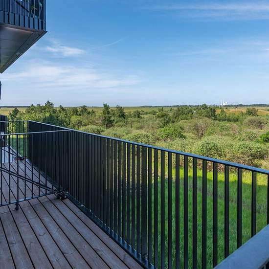 UN17 Lunden - a cohousing community for people over 40 - balcony with evening sun and an unobstructed view of nature