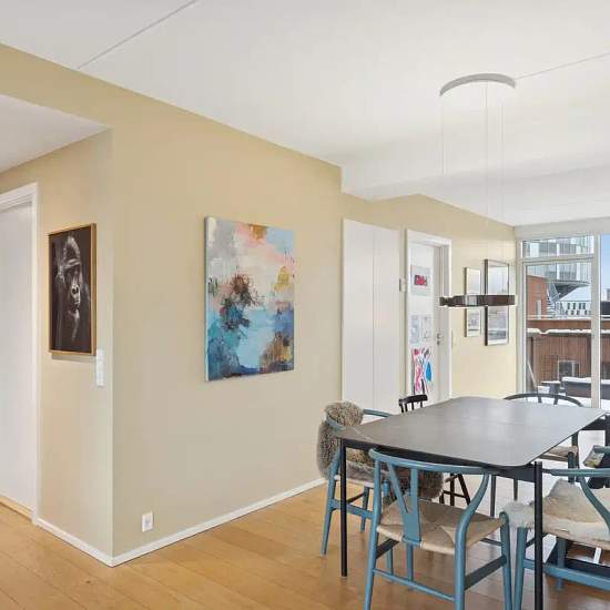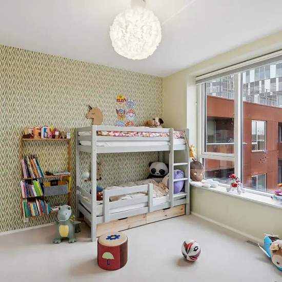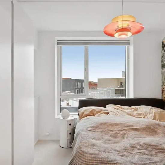 Eksklusiv lejlighed i Nordhavn Denne moderne 3-værelses lejlighed på 104 m², beliggende på 5. sal i en ejendom fra 2015, tilbyder en unik kombination af stil og funktionalitet. Lejligheden er fuldt møbleret, men med mulighed for at tilpasse møbleringen efter dine behov, såsom at fjerne eller udskifte køjesengen. Det åbne køkken-alrum er rummeligt og lyst, med et ensartet køkkenudstyr, der inkluderer opvaskemaskine, mikrobølgeovn og vinkøleskab. På lejlighedens to altaner kan du nyde både morgenkaffen eller en middag i godt selskab. De to so...