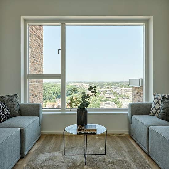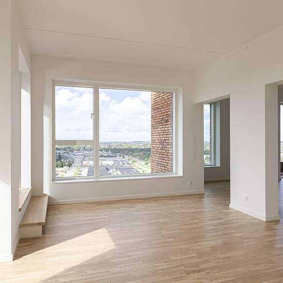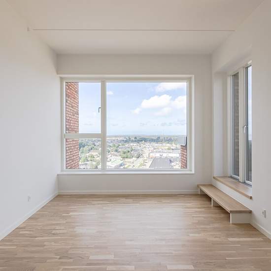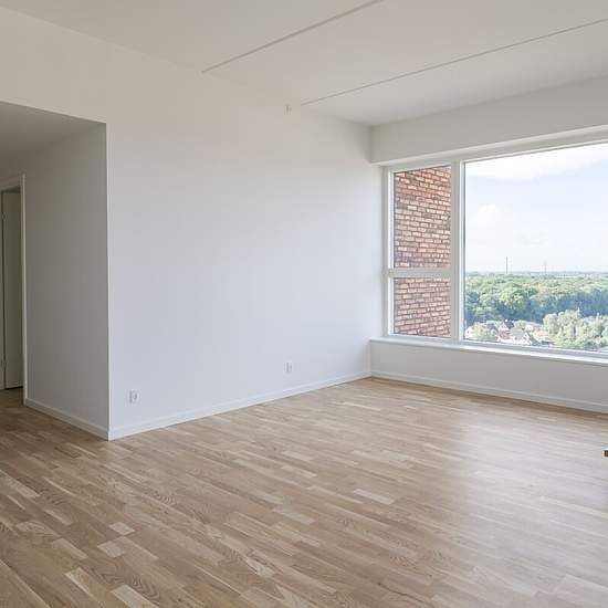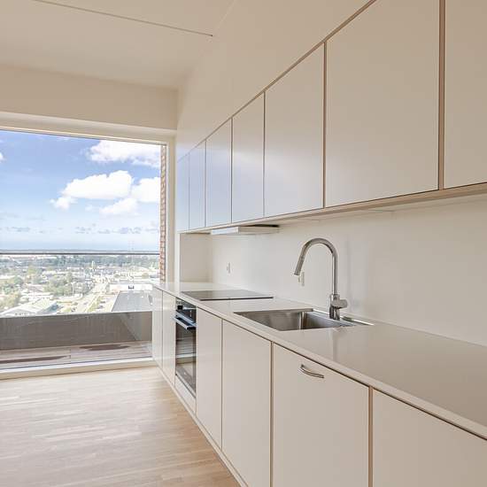 Lejemålet På 14. sal finder du denne indbydende og rummelige 4-værelses penthouselejlighed med god plads og lyse, tidløse materialer. Her bor du med lys og luft omkring dig og med en enestående udsigt over Hillerøds tage og smukke natur. Boligens naturlige samlingspunkt er det store køkken-alrum med et lyst og funktionelt køkken fra Invita. Herfra kan du åbne døren til en vestvendt altan med udsigt over tirsdagsskoven. I forlængelse af køkken-alrummet ligger stuen – et lyst og imødekommende rum med udgang til en skøn, sydvestvendt tagterrass...