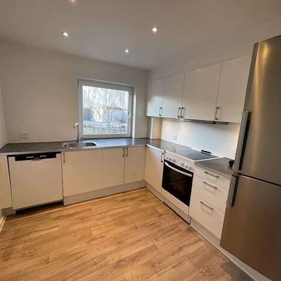 Velindrettet rolig 4 vær, 84 m2, beliggende på 1. etage. Tæt på centrum, institution, skole, indkøbscenter, skov, fjord og strand. Ikke langt fra motorvejsafkørsel Vejle Nord (nr. 60)og industriområde Vejle Nord og Business Park. Lejligheden består af fordelingsgang med spots i loftet, stor stue m udgang til stor lys balkon. Stort nyt køkken med opvaske eller vaskemaskine. Spots i loftet. Køkkenet er indrettet med plads til spisebord. Stort soveværelse, samt 2 gode ekstra værelser med skabe. Nyt badeværelse med udvidet bruseniche og led-spot...